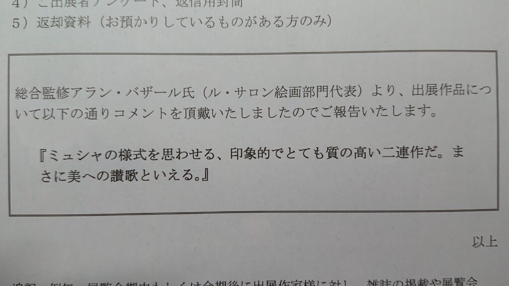 もし賞を受賞していたら——それで完結していたかもしれない。賞を受賞できかったからこそ、アラン・バザール氏の目は私の作品の本質へと向かい、フランス語ポートフォリオを読み込み、「ミュシャの様式を思わせる、まさに美への賛歌」という言葉を生み出した。