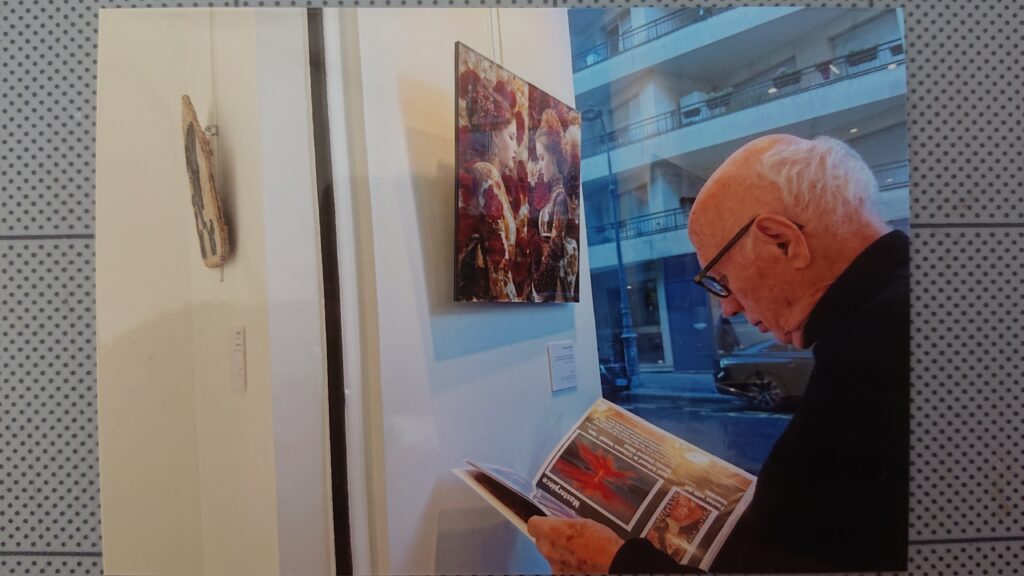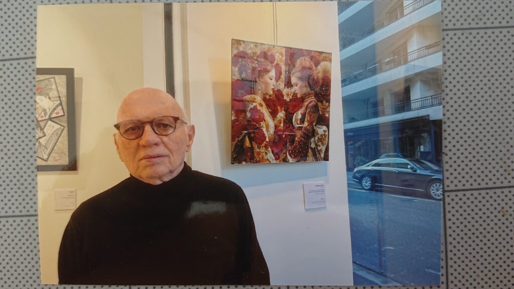 パリ16区、リンダファレルギャラリーの白い壁に掲げられた「ネオ・ジャポネスク二連画 – ミュシャのバレンタイン – ネオ・モザイック・ステンドグラス」。そしてその前に立つ、一人の男性の姿。