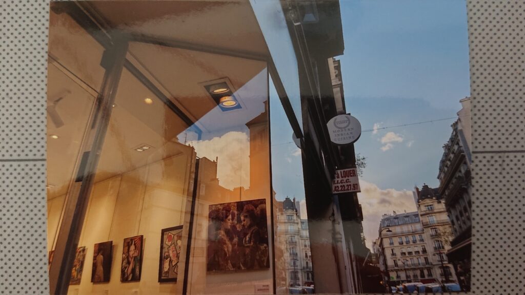 4枚目——ギャラリーの入り口ガラス越しに、パリの街並みと共に私の作品が輝いていた。