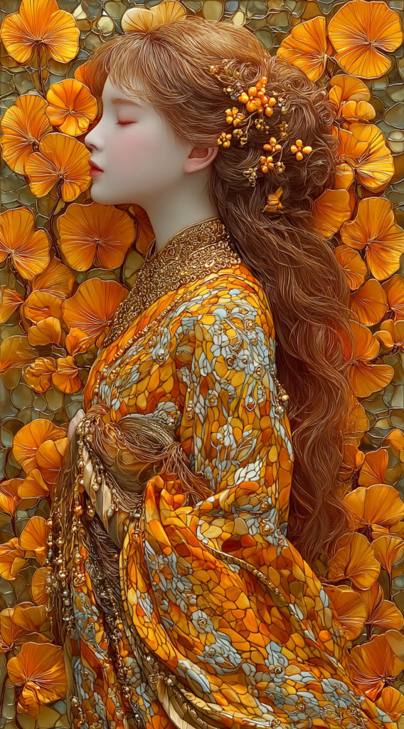 画面を満たす黄金の山吹の花々は、無数の光の断片として積み重なり、まるで大聖堂のステンドグラスが内側から発光するかの如き深みと輝きを放つ。着物と洋の意匠を織り交ぜた和洋折衷の衣装——ミュシャの装飾美と日本の雅が融合した新境地の表現——をまとった女性の姿は、気品と静謐さを湛え、黄金色のハローに包まれている。背景を埋め尽くす緻密なモザイクの粒子一つ一つが、光を受けて異なる表情を見せ、作品全体が「生きた光」として息づいている。
