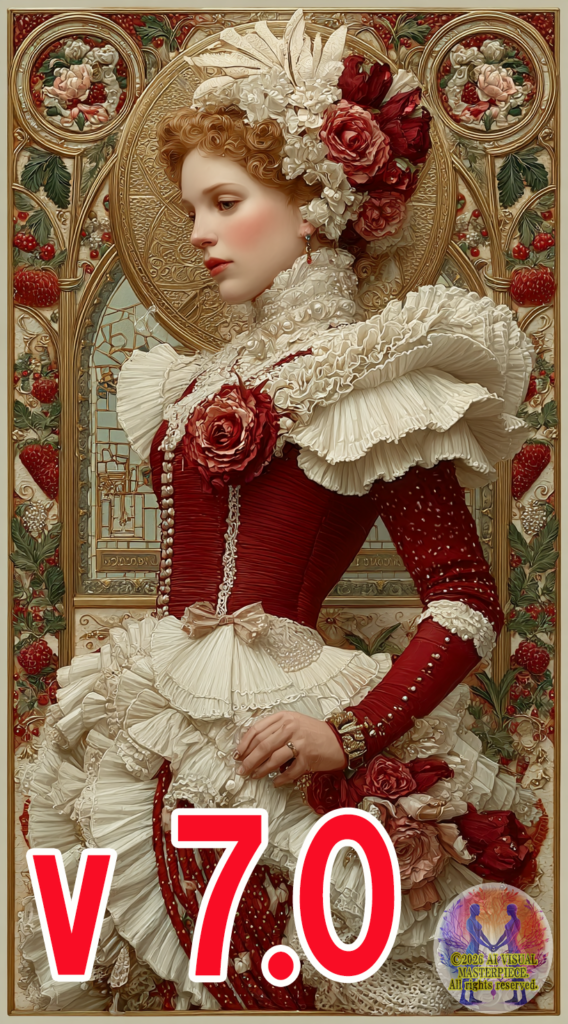 Looking at the v7.0 output image — realism has increased across the board, and the quality of skin, hair and fabric texture has improved. The detail in the dress, particularly the frills and lace, surpasses v6.1 in precision. However, the expression of glass fragments is now confined to the background, and the figure itself has begun to take on a quality closer to “three-dimensional porcelain.” It is beautiful — but a quiet divergence from the stained glass technique has begun.