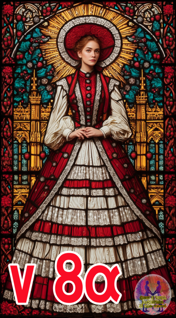 v8.1の出力画像を見ると——修正プロンプトの効果が明確に現れている。ドレスにリーディングラインが復活し、モザイクガラスの質感が再び表れている。赤いガラス片と白いガラス片が黒いリーディングラインで区切られ、「ステンドグラスの衣装」という表現が戻ってきた。