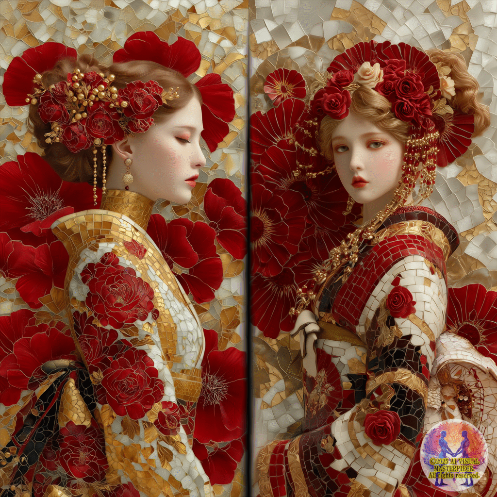 This diptych contemporarily reinterprets the Japonisme beloved by Art Nouveau master Alphonse Mucha, expressing the essence of Japanese love. The left beauty, set against a golden background with red roses, embodies “quiet affection,” while the right beauty, against a deep crimson background with passionate red roses, represents “burning love.” This contrast symbolizes the duality of Japanese love—outwardly modest yet inwardly burning with intense passion.