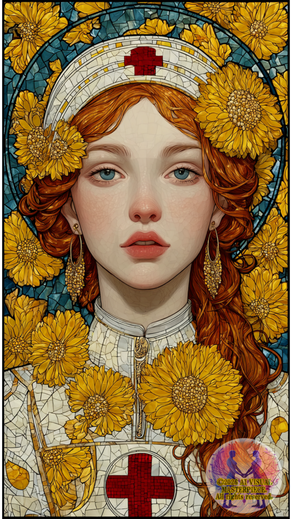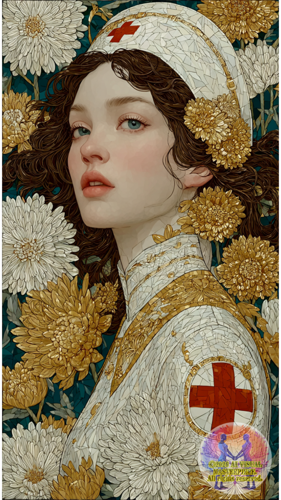 黄色いキンセンカが背景を彩り、その花言葉「変わらぬ愛」「献身」「慈愛」「乙女の姿」「静かな思い」が、看護師の崇高な使命を完璧に象徴しています。Yellow calendula flowers grace the background, with their flower language of “unchanging love,” “devotion,” “compassion,” “maiden’s grace,” and “quiet thoughts” perfectly symbolizing the noble mission of nurses.