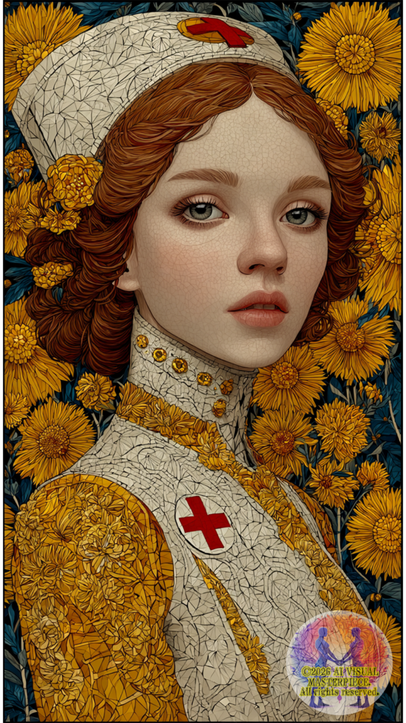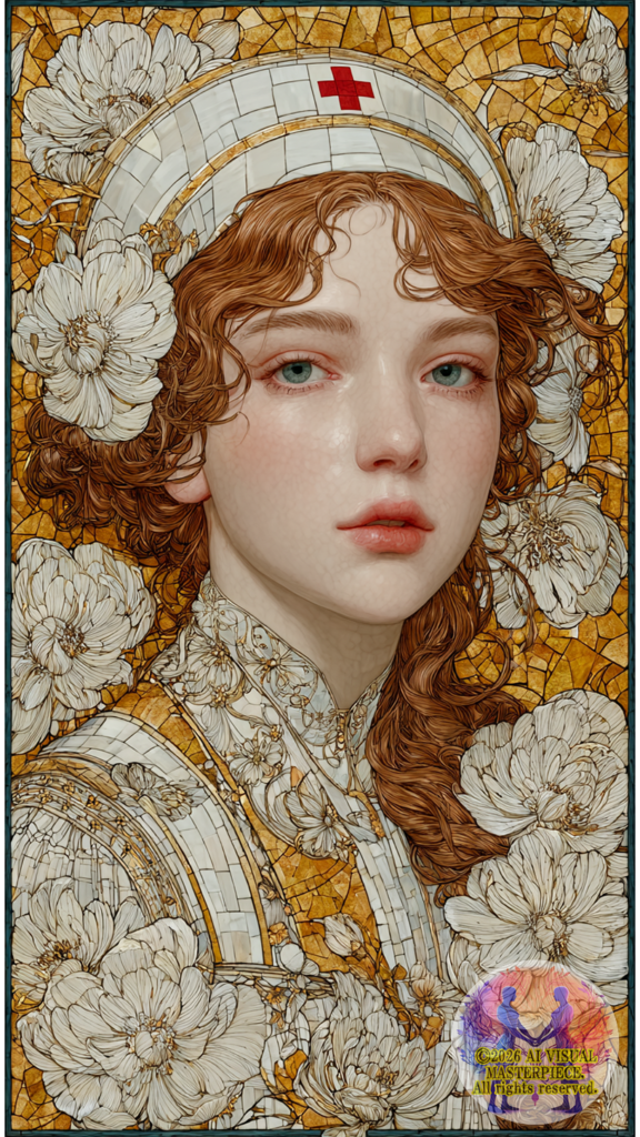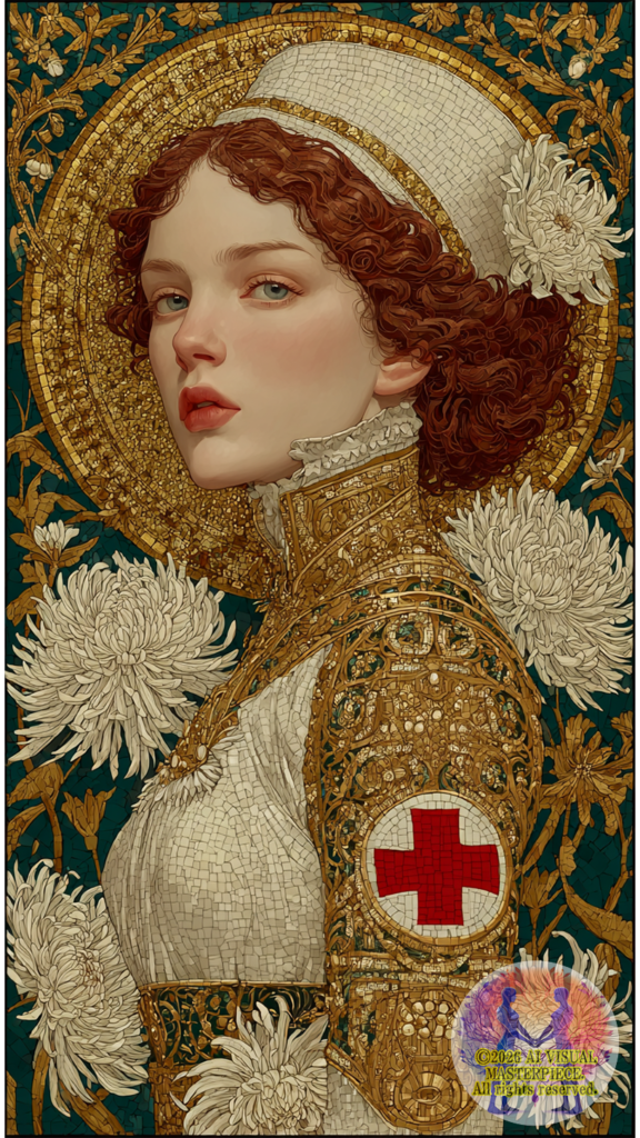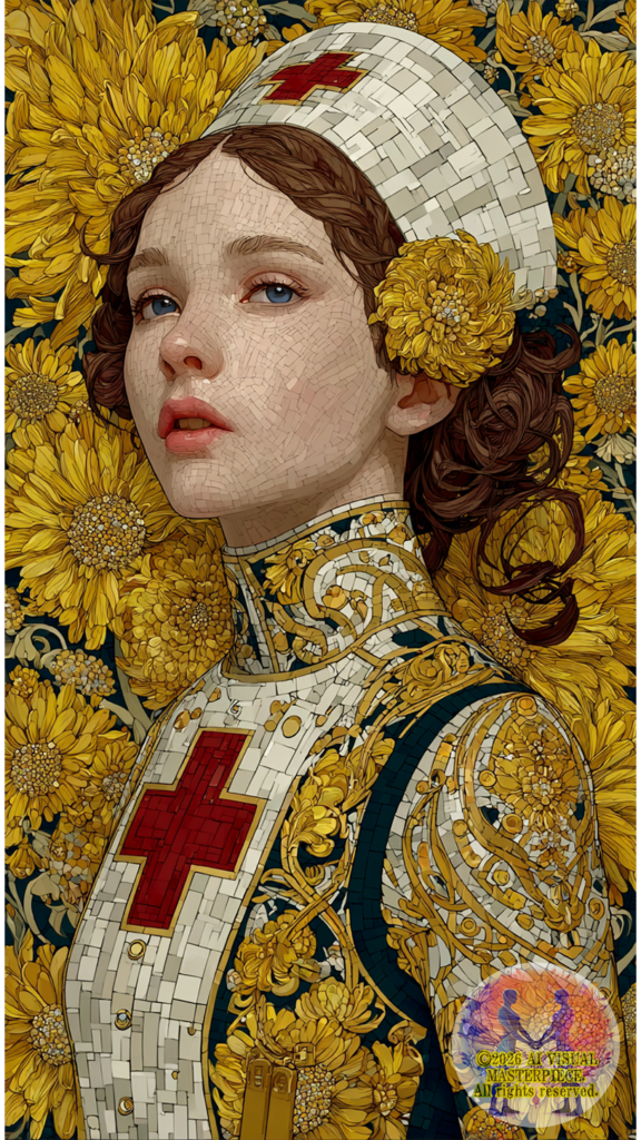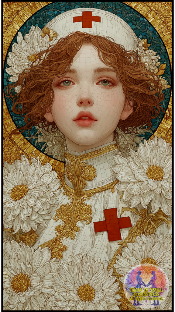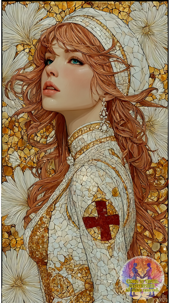 「ネオ・モザイック・ステンドグラス」技法の8つの核心要素が見事に統合され、特に白い制服の質感表現と赤十字マークの象徴性が際立っています。The eight core elements of the “Neo-Mosaic Stained Glass” technique are beautifully integrated, with particular emphasis on the texture expression of the white uniform and the symbolism of the red cross emblem.