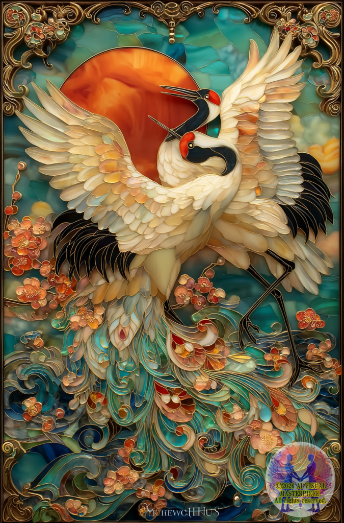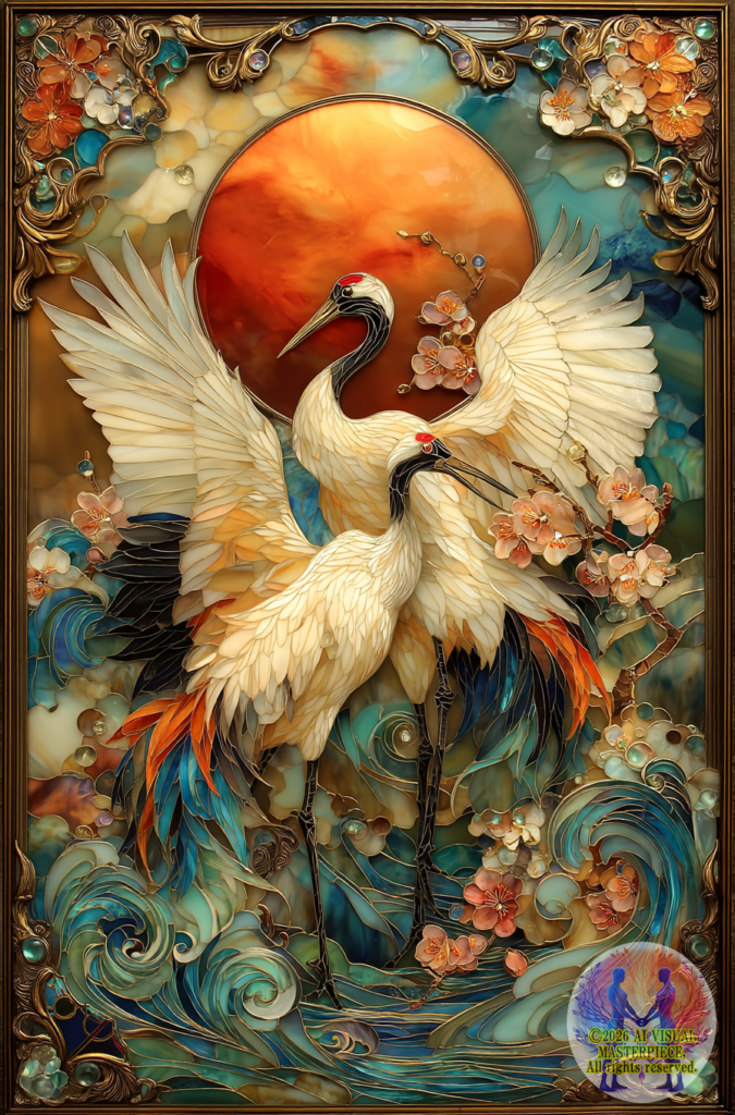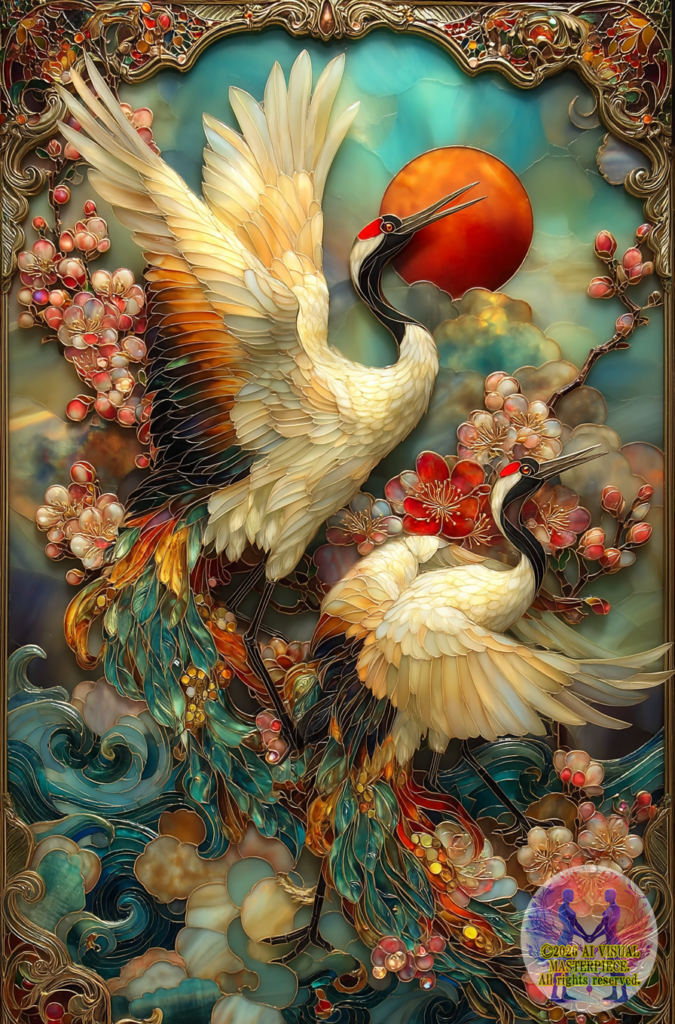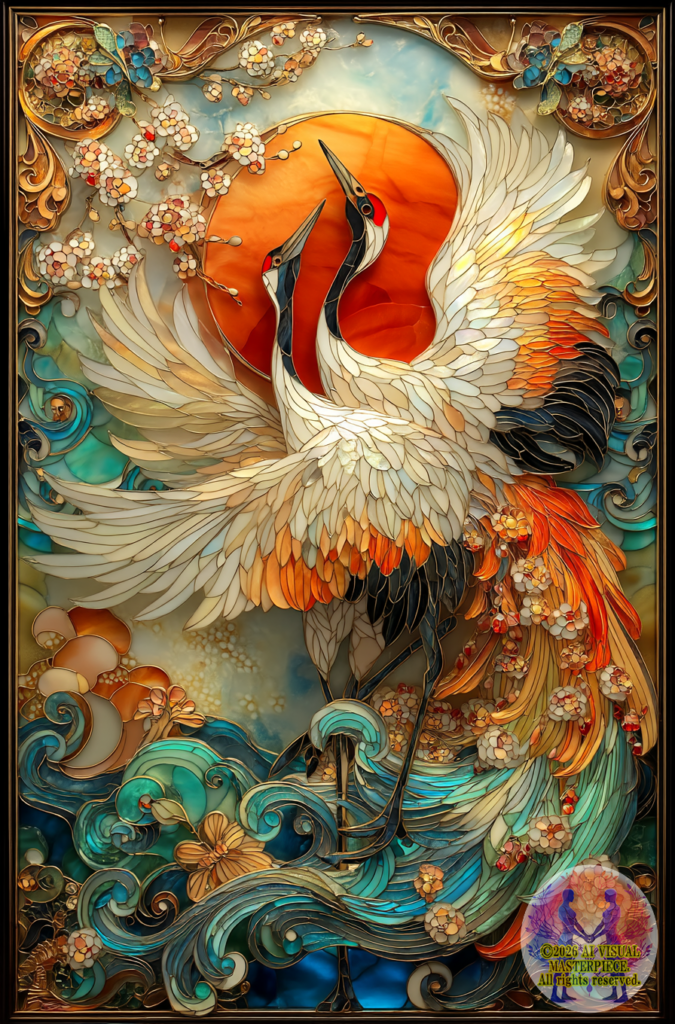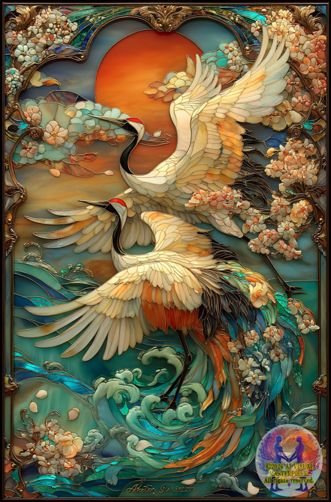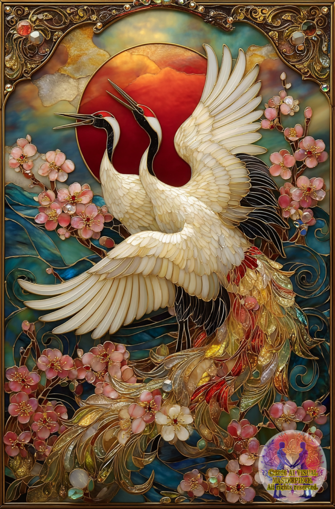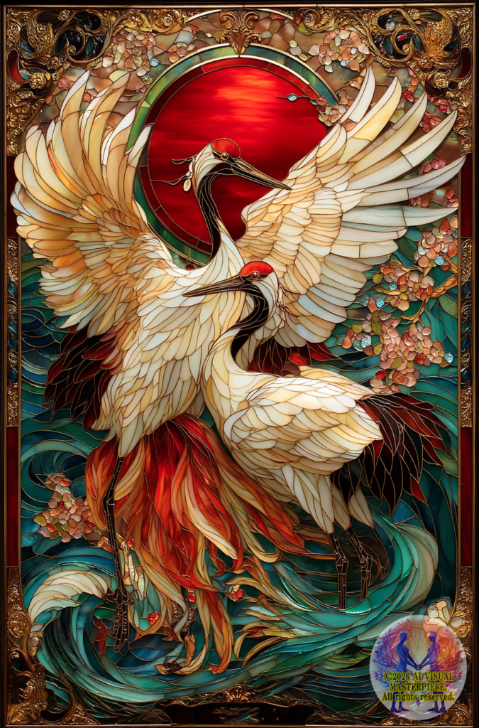 The white cranes symbolize purity and sanctity💫 Their graceful flight with black wingtips is expressed through countless glass fragments. Each piece captures light, reflects it, and radiates brilliance✨
