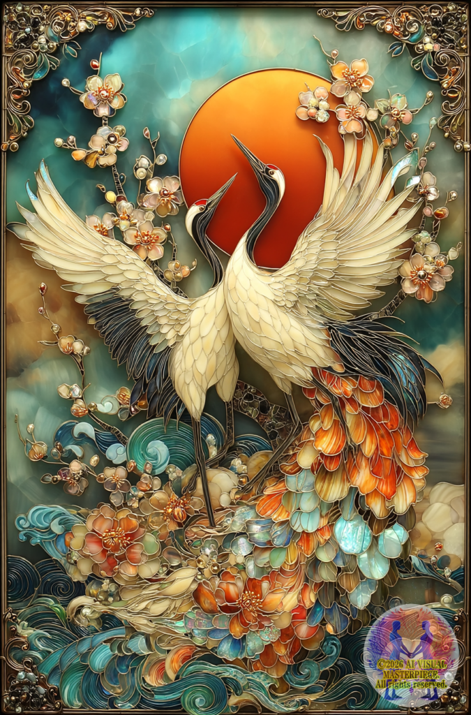 Imperial Year 2686, National Foundation Day—White cranes, crimson rising sun, swirling blue sky, scattering cherry blossoms—all shine eternally through glass mosaic. Praying for Japan’s peace for a thousand years and the realization of world peace—I offer this work to the world🙏💖