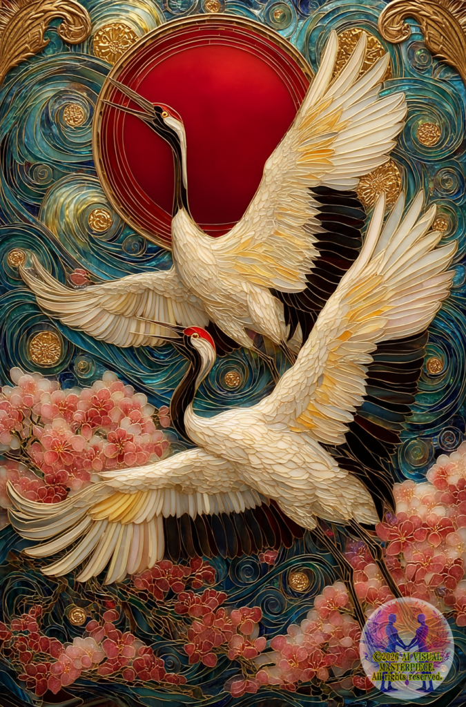 「鶴は千年、亀は万年」—白い鶴は純粋さと神聖さの象徴、真っ赤な朝日は日本の国旗と新しい始まり、深い青空は平和で安定した未来を示す🗼