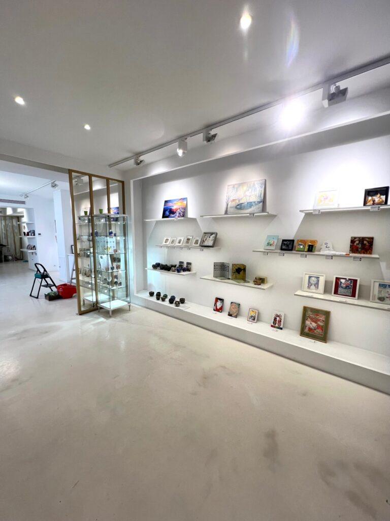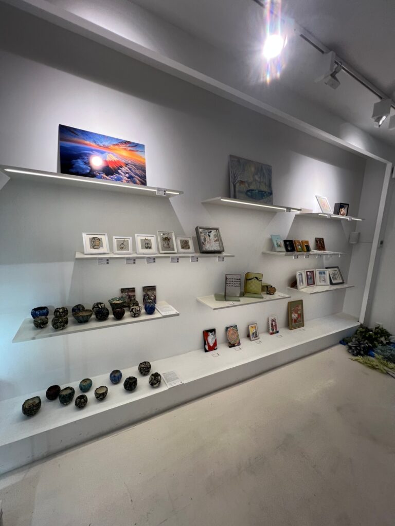 “Since the wall was wire-based and the mounting shape on the back was unstable, we installed them on a shelf as shown in the exhibition photos. This shelf was the prime spot that became the centerpiece of the venue, and combined with the content of the works, they attracted considerable attention.”