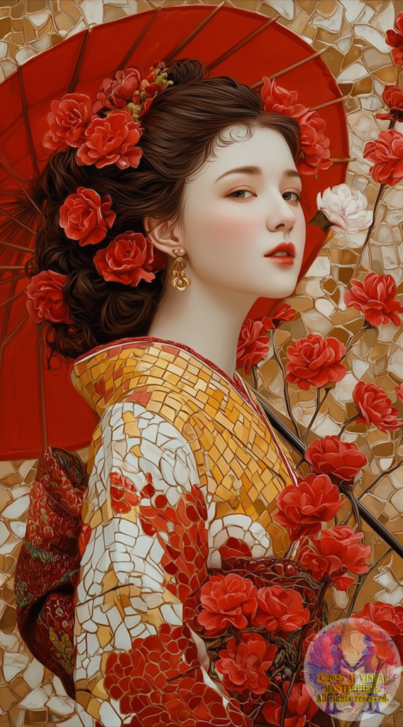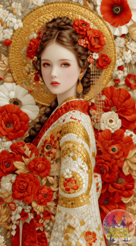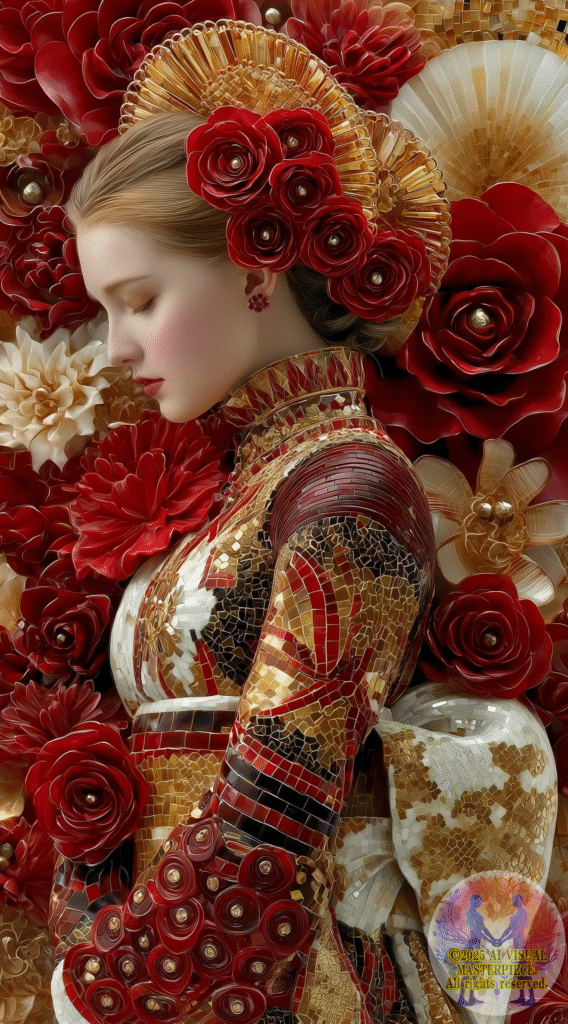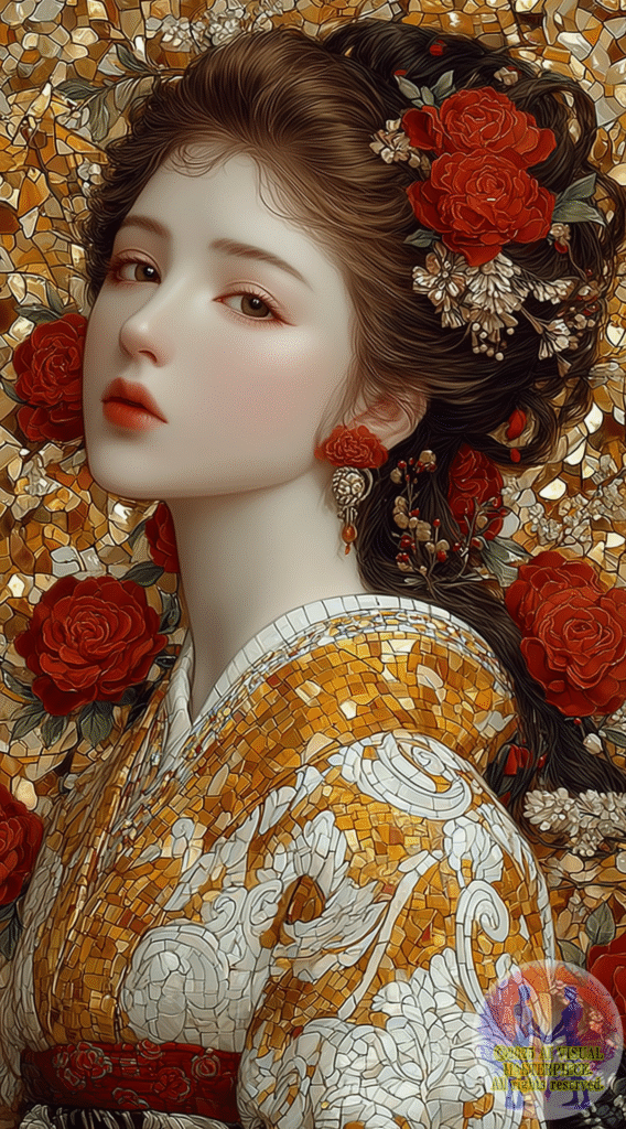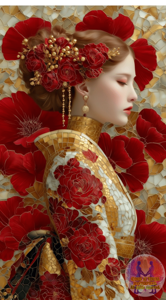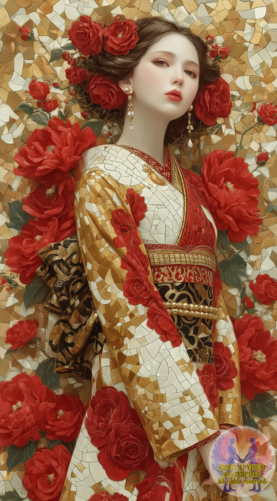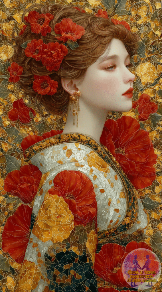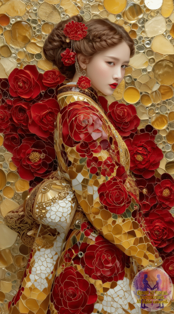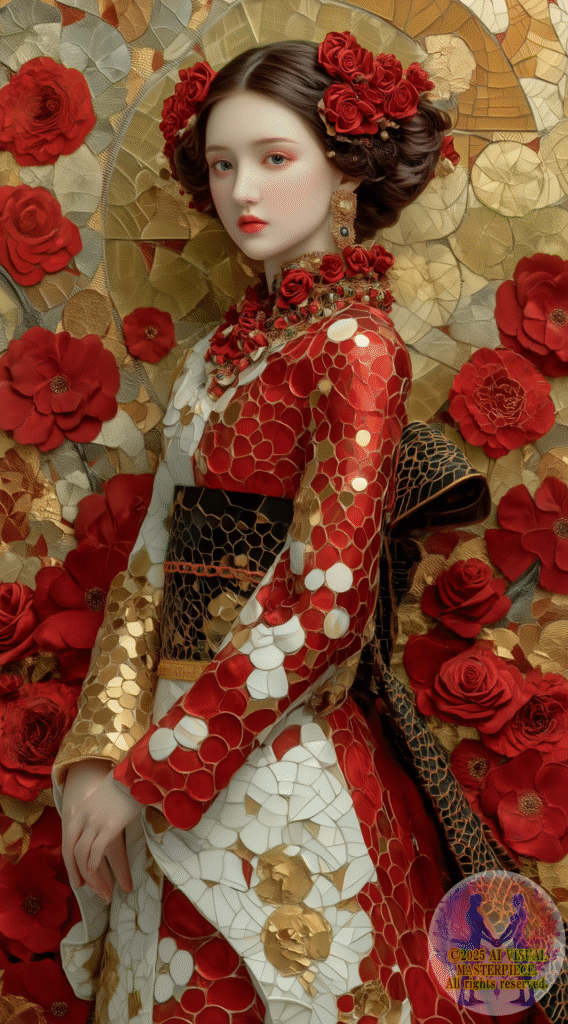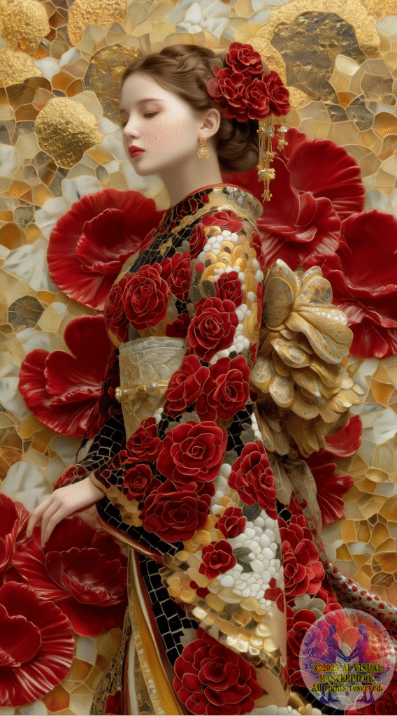 The elegant yet somehow nostalgic atmosphere that Mucha’s works possess—while recreating this with modern technology, I have infused it with 21st-century aesthetic sensibility. The bold arrangement of deep red roses, complex patterns of golden mosaics, and the contemporary beauty dwelling in the woman’s profile.