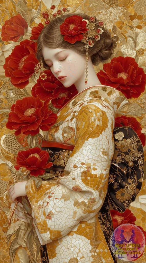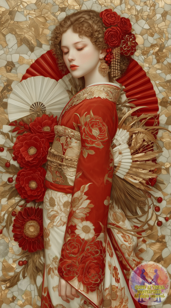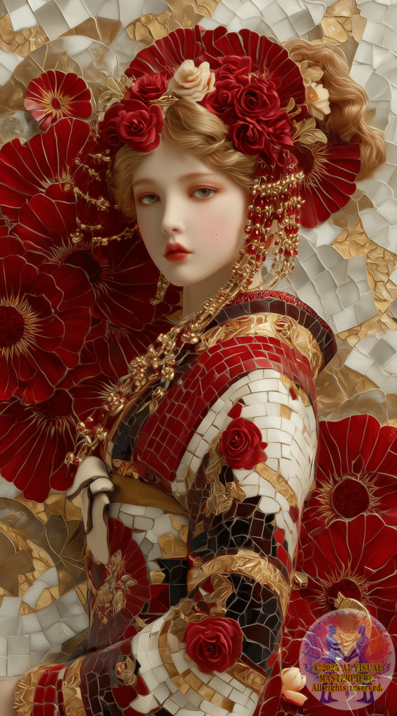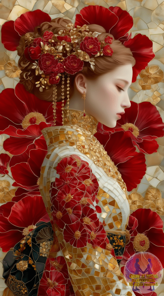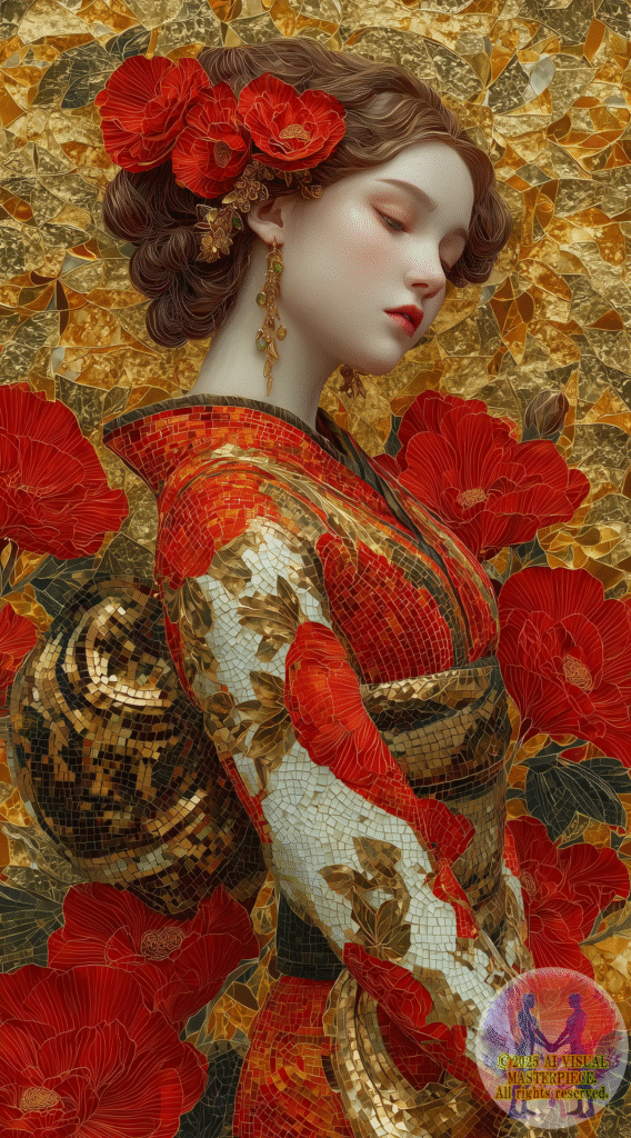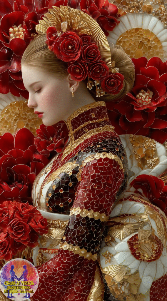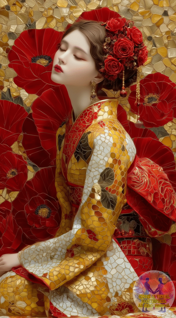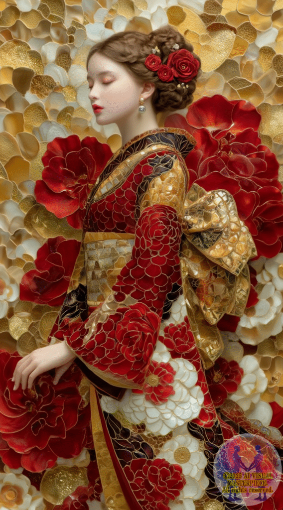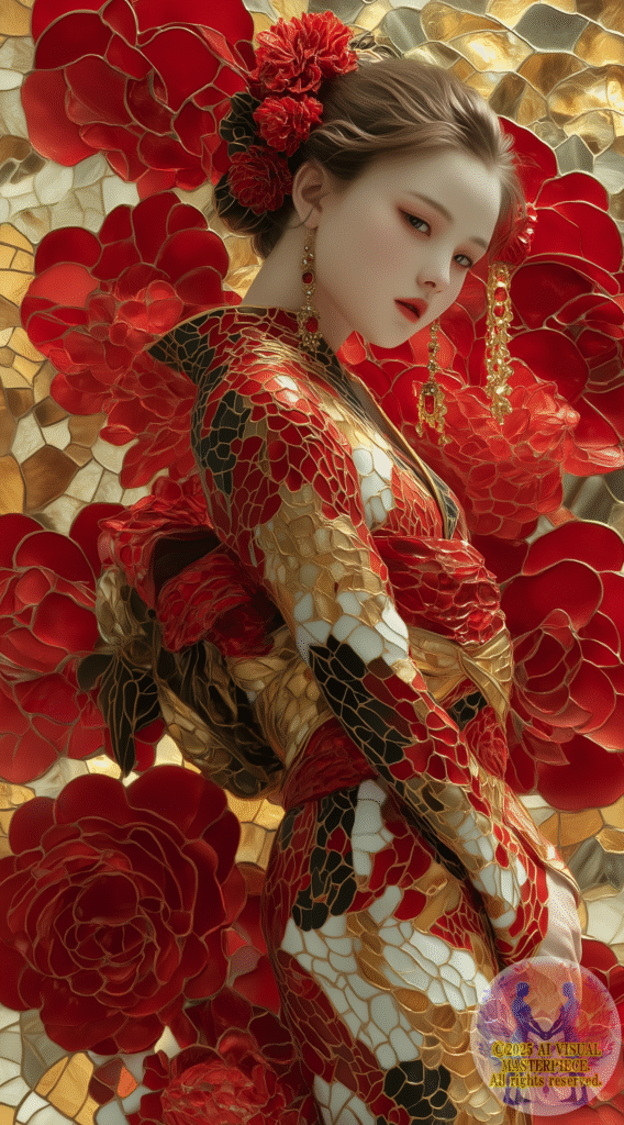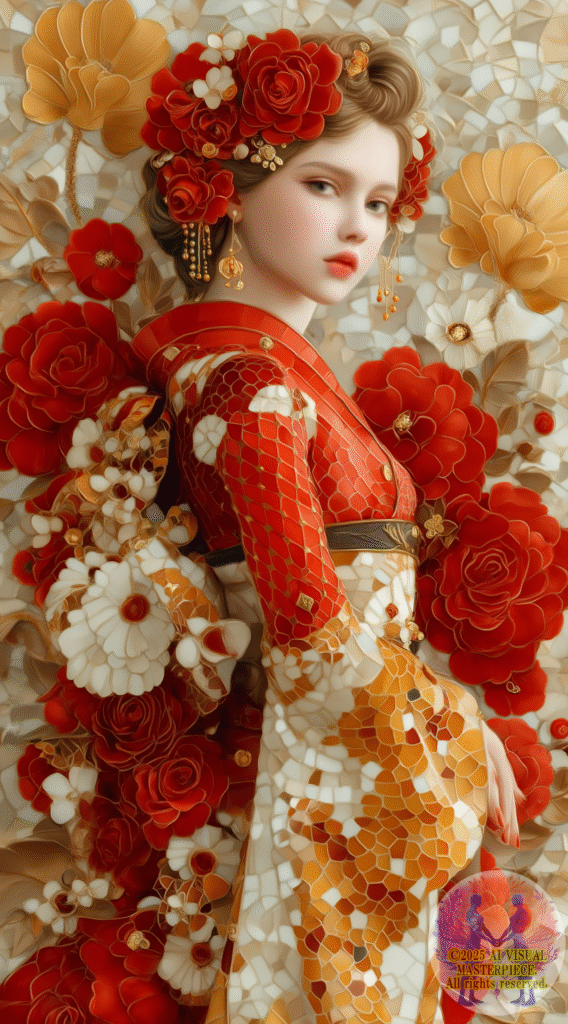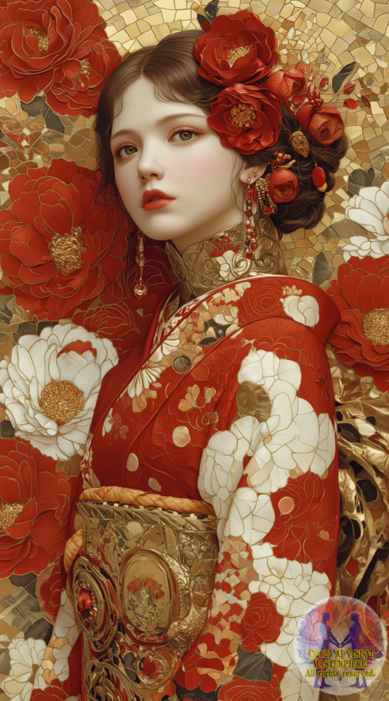 The elegant yet somehow nostalgic atmosphere that Mucha’s works possess—while recreating this with modern technology, I have infused it with 21st-century aesthetic sensibility. The bold arrangement of deep red roses, complex patterns of golden mosaics, and the contemporary beauty dwelling in the woman’s profile.