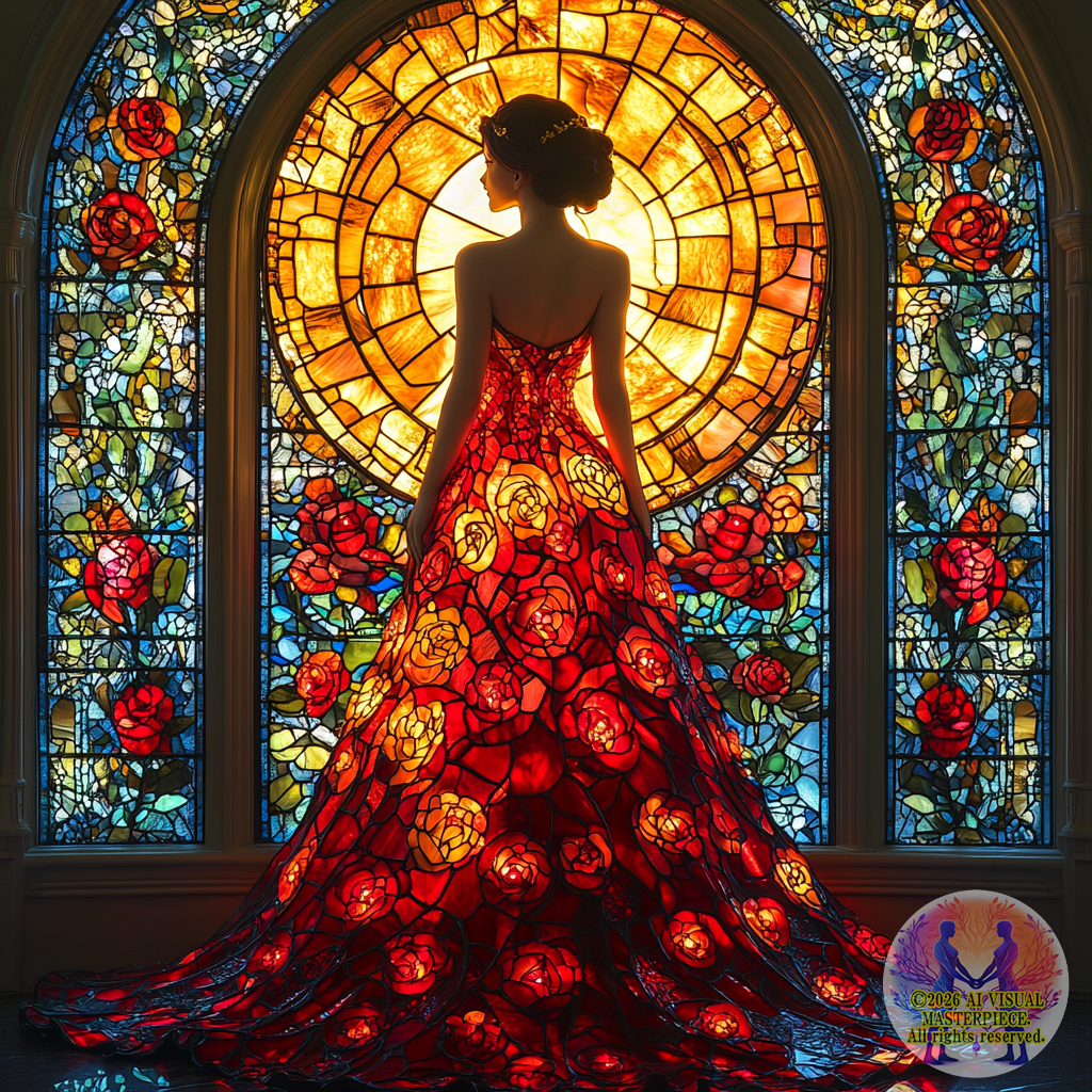 背後から差し込む太陽光が、ドレスとステンドグラス窓を輝かせ、まるで光そのものが生命を得たかのような美しさです。
