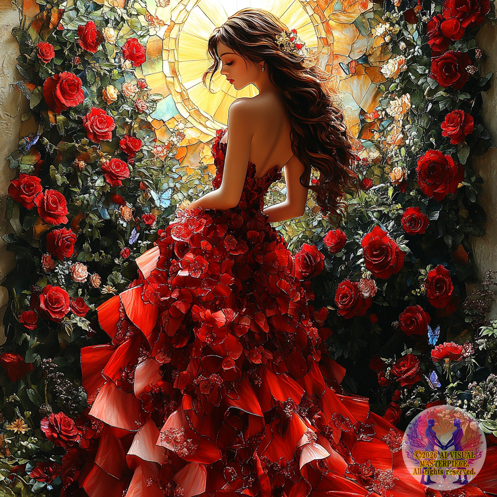 A dress of crimson roses, like stained glass throne