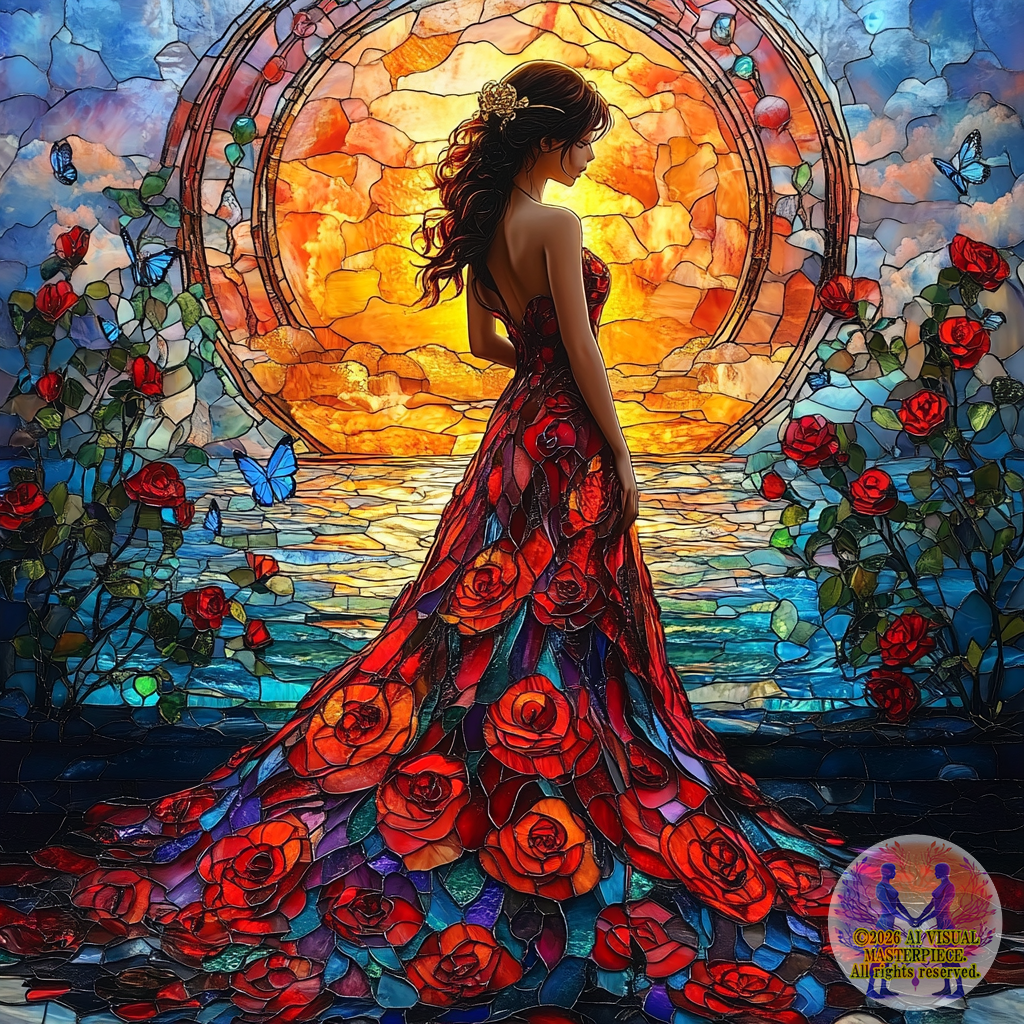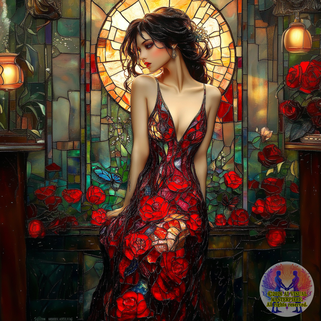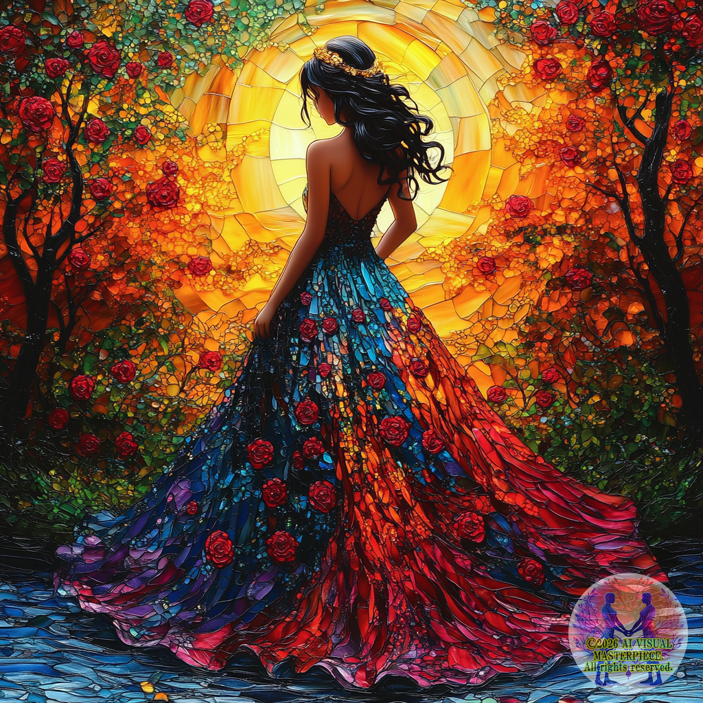 深紅とオレンジと金色のバラが描かれたAラインのドレスを纏う美女が、ステンドグラスの窓の前に立ちます。