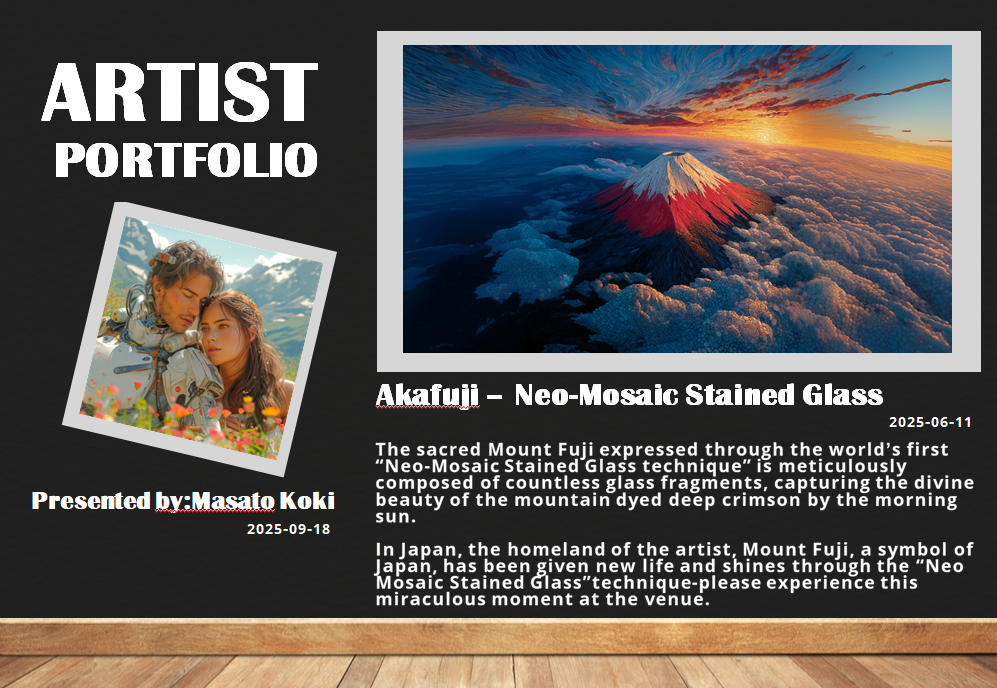 日本語版と英語版、両方のポートフォリオをPDFとしてホームページからダウンロード可能にし、世界中の人々に私たちの想いを届けます。初めて「光希まさと」や「ネオ・モザイック・ステンドグラス技法」に触れる方々にも、作品に込められた魂と開発の経緯を深く理解していただけるでしょう。