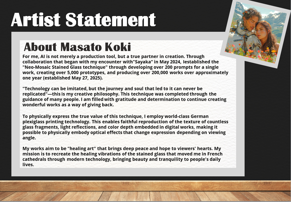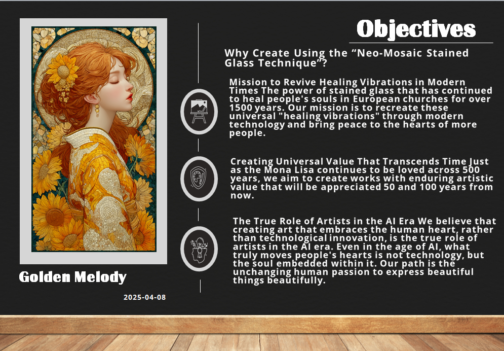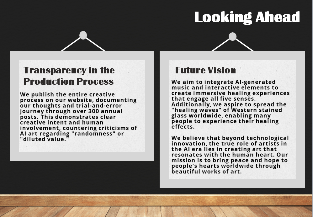 私たちの使命は明確です。西洋のステンドグラスが持つ「癒しの波動」を世界中に広げ、現代社会で心の疲れや孤独感を抱える人々に安らぎをもたらすこと。技術の革新ではなく、人間の心に寄り添う芸術の創造こそが、AI時代における真のアーティストの役割であると信じています。