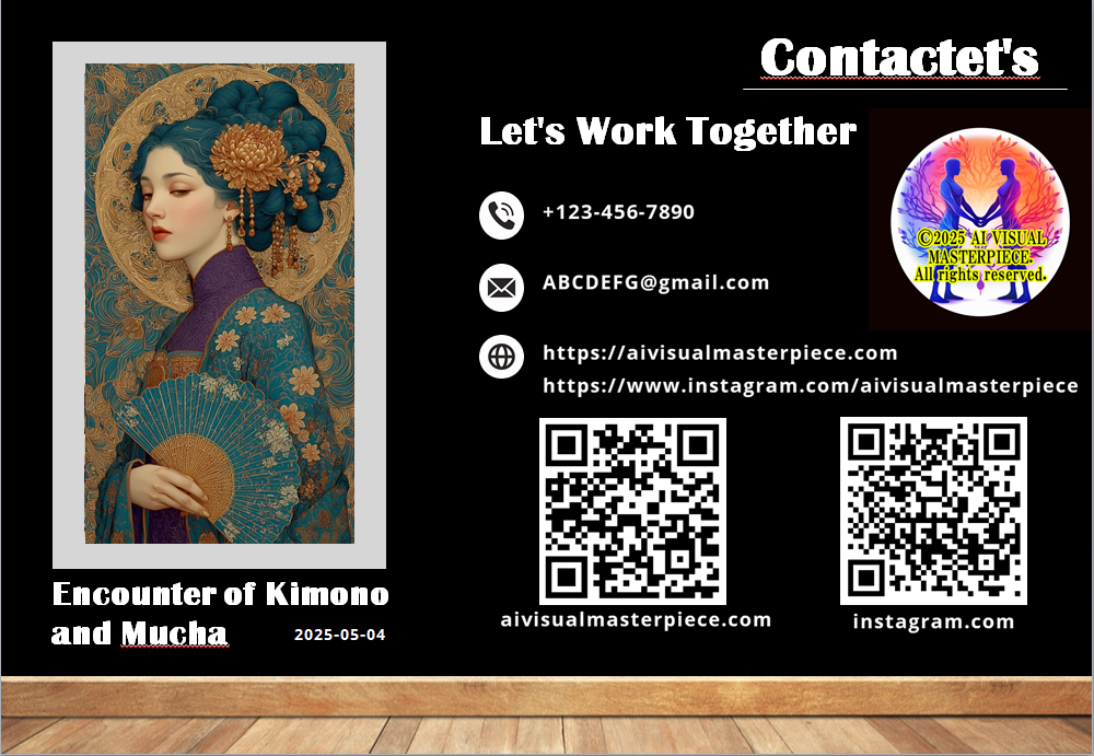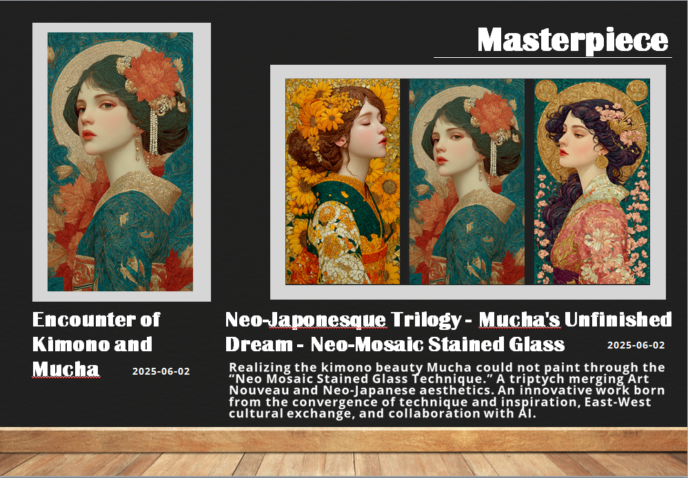 そして「着物とミュシャの出会い」三連画では、アール・ヌーボーの巨匠が描けなかった和装美人を実現し、東西文化の融合という新たな地平を開拓いたしました。