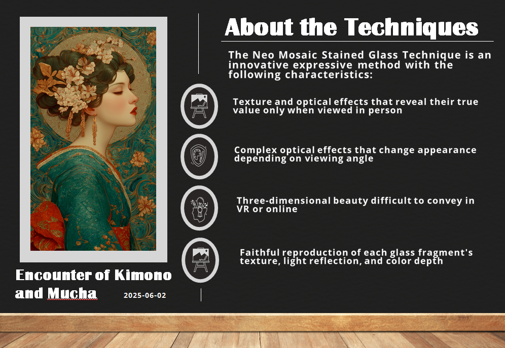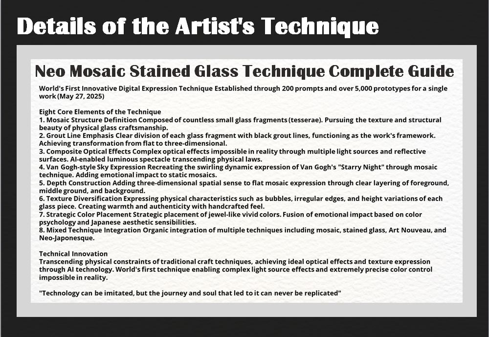 ポートフォリオでは、ドイツプレキシグラス印刷技術の重要性についても詳述しています。デジタル作品でありながら、実物でのみ体感できる質感、光の反射、色彩変化—これらこそが「ネオ・モザイック・ステンドグラス技法」の真価を証明するものです。