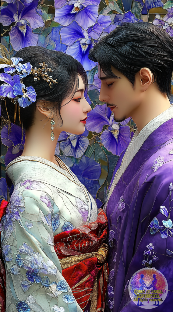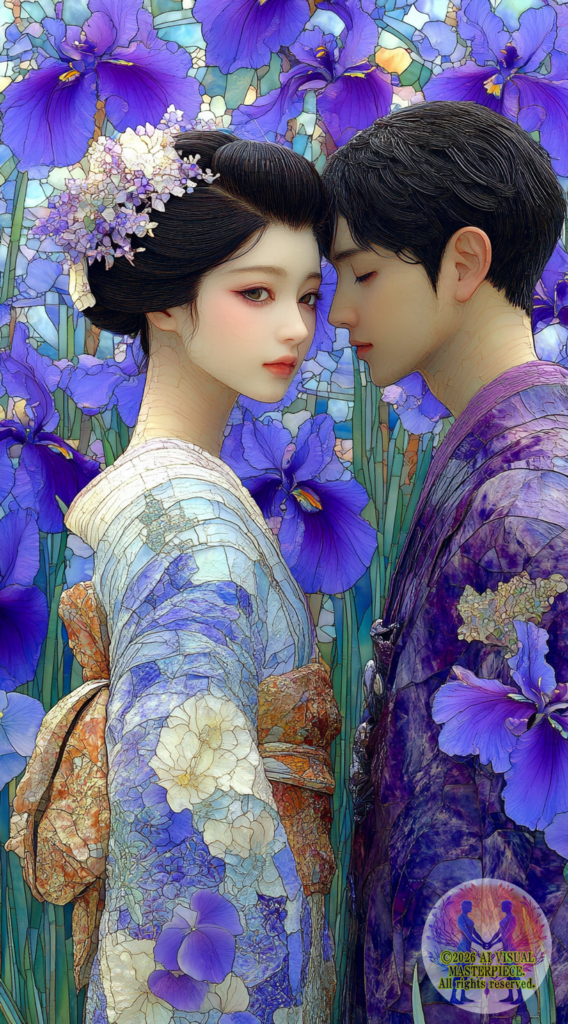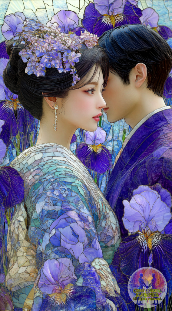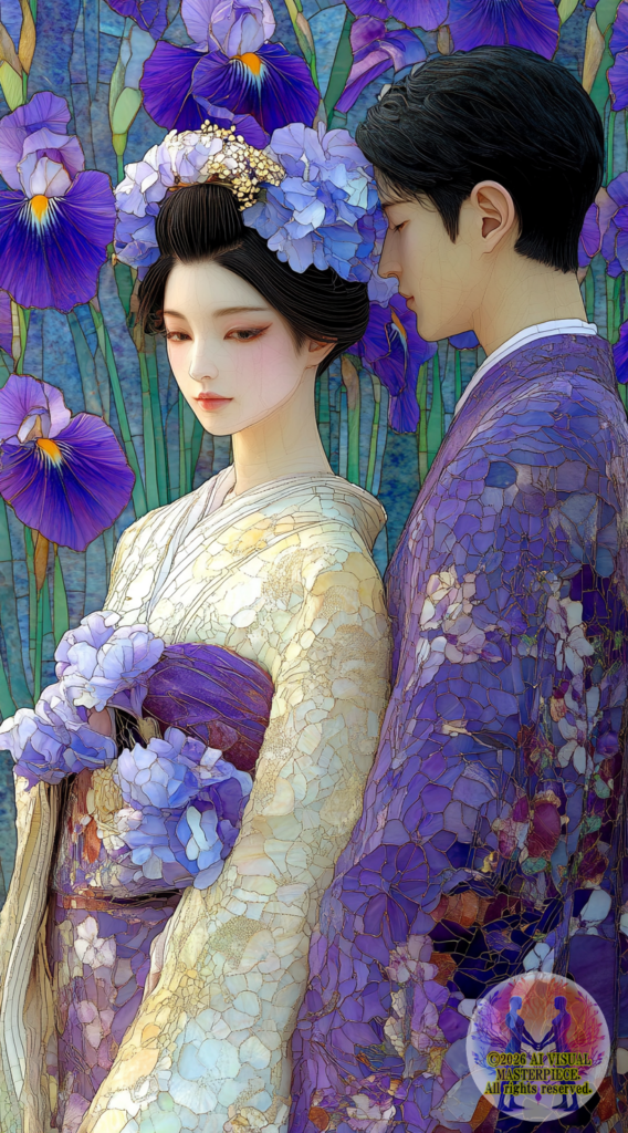 黒髪をたおやかに結い上げた女性の髪に、紫の花菖蒲の花冠が咲き誇る。繊細な耳飾りが揺れる横顔に、静かな微笑みが宿る。その傍らに男性が寄り添い、二人の鼻先がわずかに触れ合うほどの距離で向き合っている。背後には深紫と青紫の大輪の花菖蒲が幾重にも重なり、パープルブルーの光が画面全体を包み込む——まるで祈りのように。