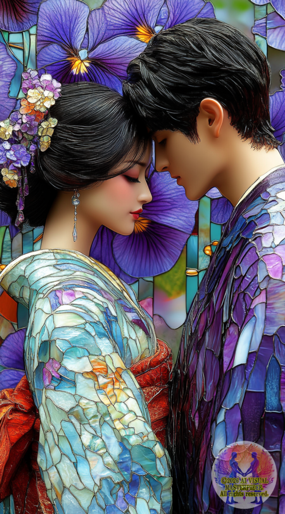A woman with her black hair elegantly pinned up wears a crown of purple iris blossoms. Beside her, a man stands quietly, their faces so close the tips of their noses almost touch — each feeling the other’s presence. Behind them, great iris blossoms in deep purple and blue-violet are layered upon one another, as though blessing the two. Golden leading lines flow through both kimonos, and a cool blue light — resonant with Chartres Blue — envelops the entire canvas.