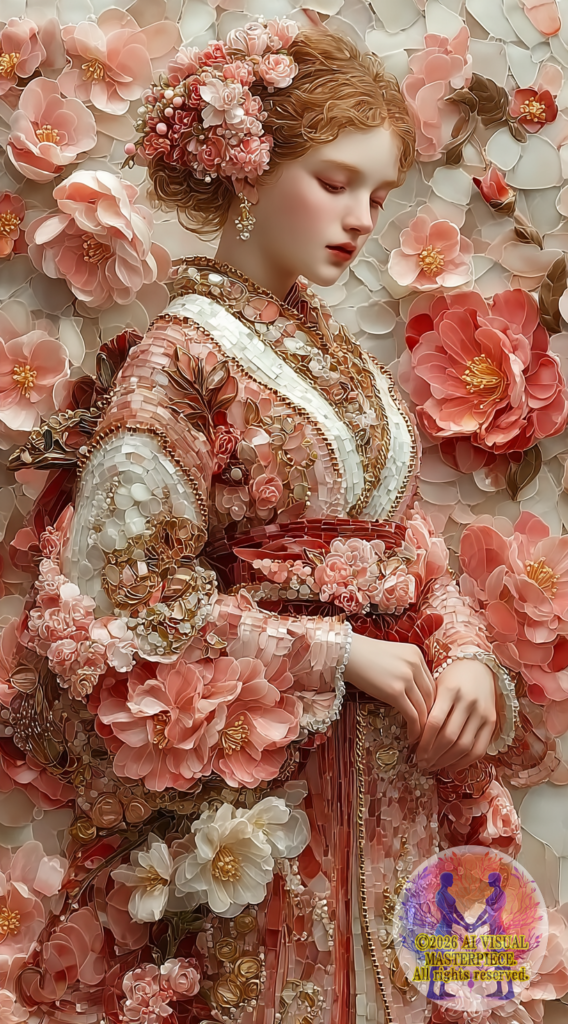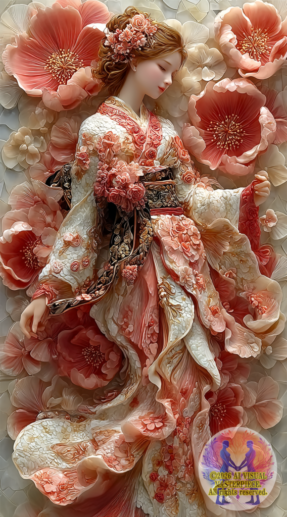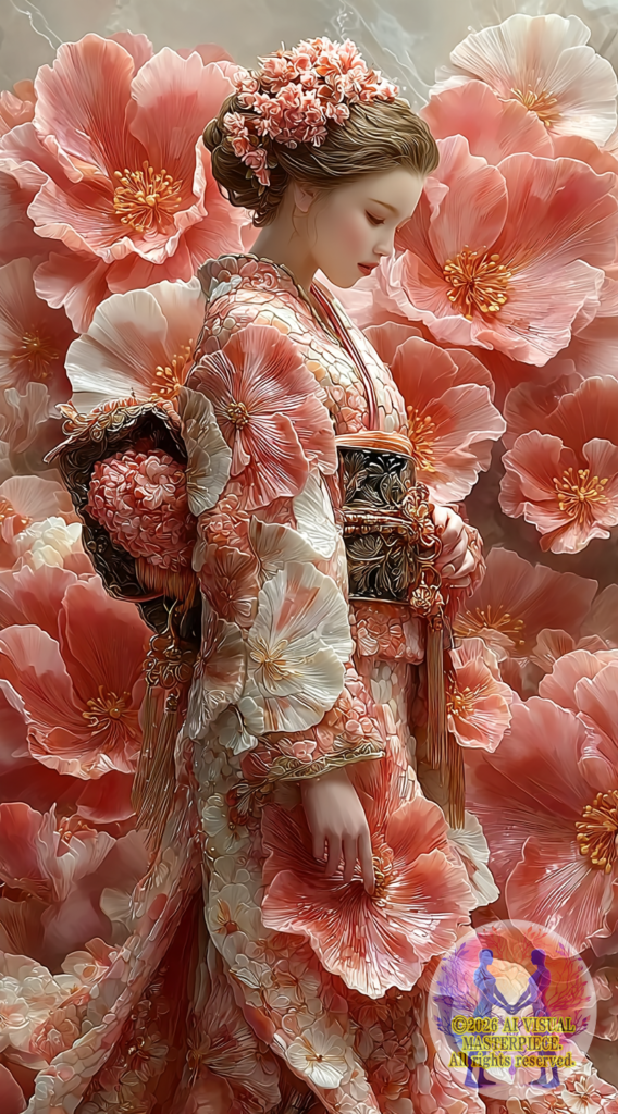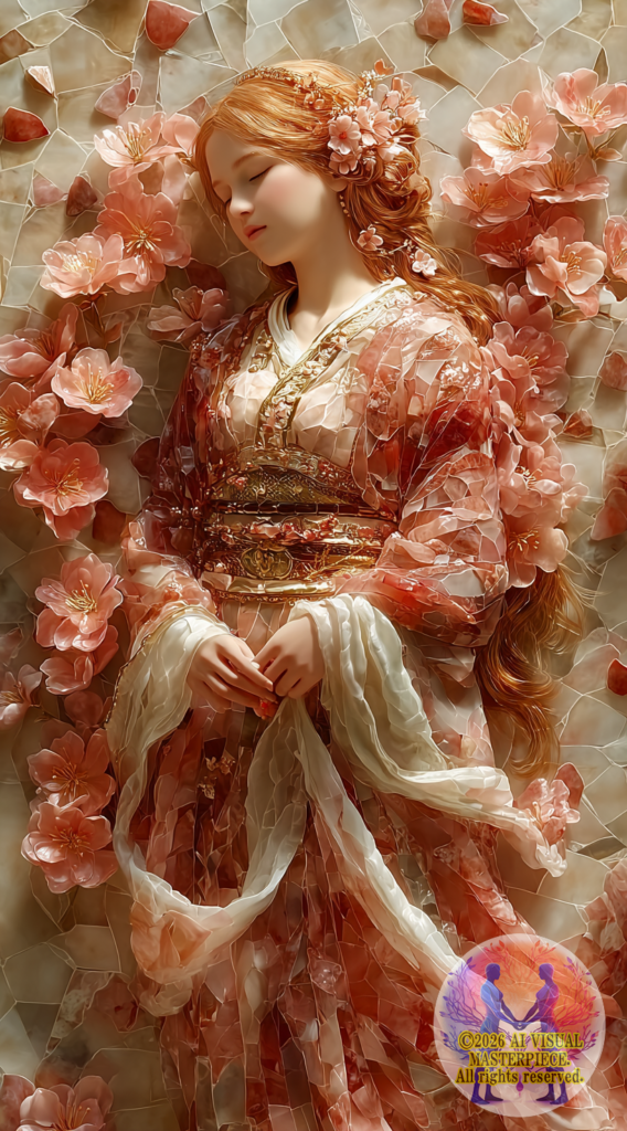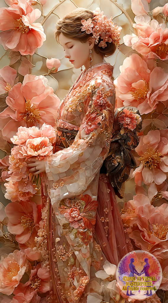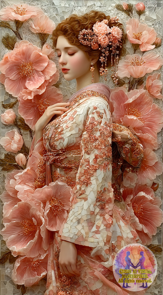 桃色の花びらに包まれた優雅な女性—この作品は、三月三日の桃の節句に捧げる永遠の愛と世界平和への祈りを込めて創造されました。