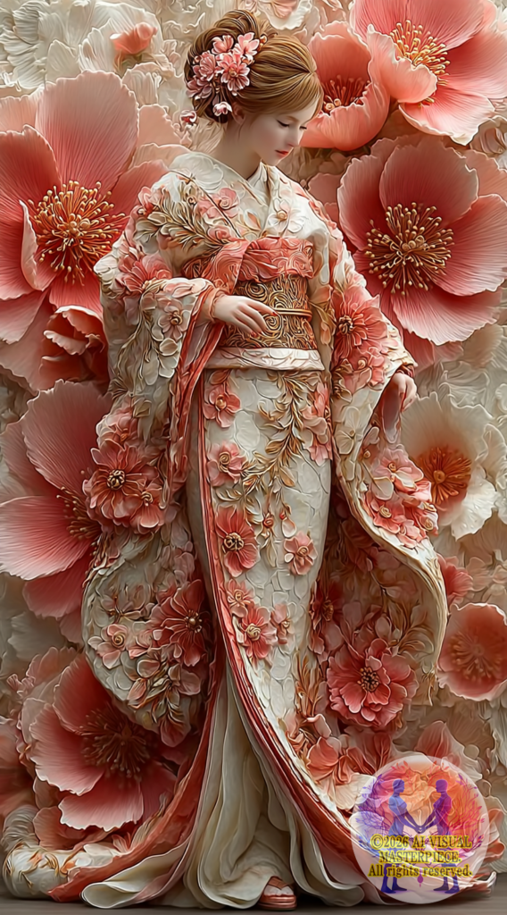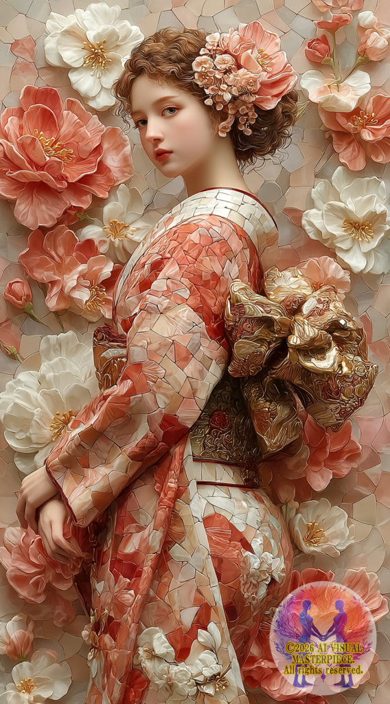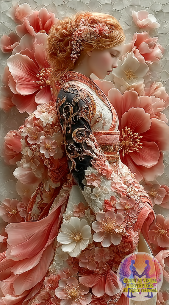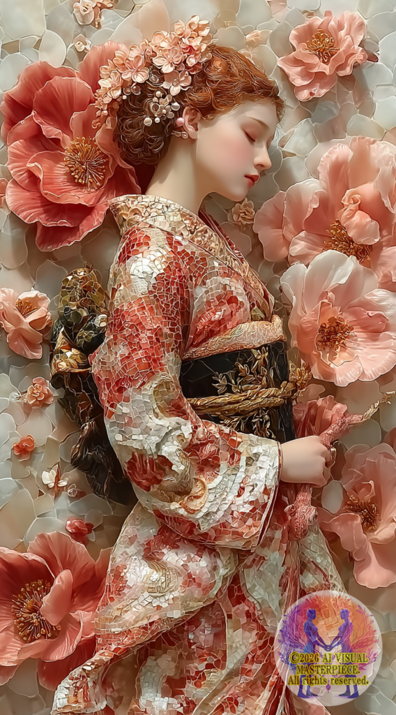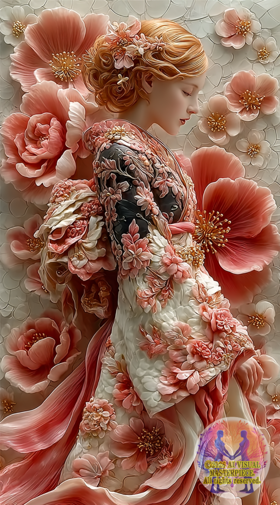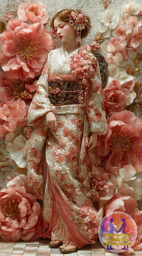 桃色の花びらに包まれた優雅な女性—この作品は、三月三日の桃の節句に捧げる永遠の愛と世界平和への祈りを込めて創造されました。