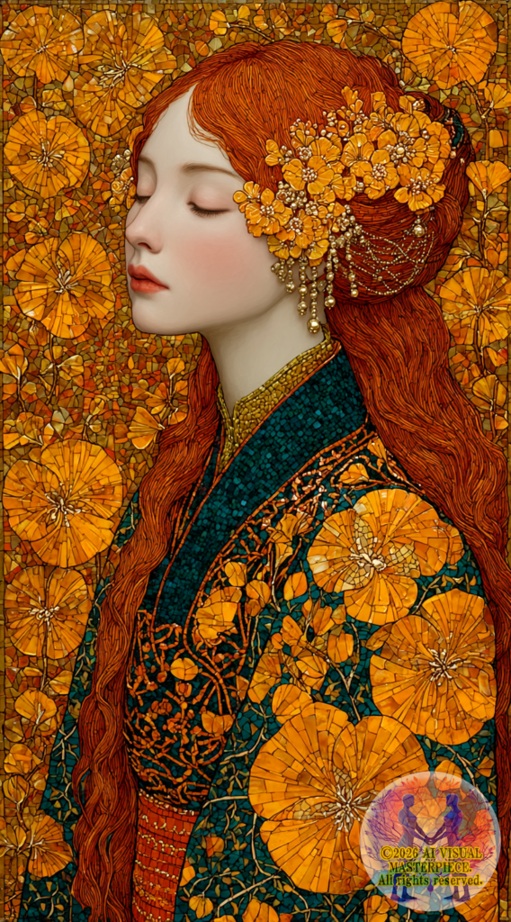 This work stands as proof that the “Neo-Mosaic Stained Glass Technique,” established on May 27, 2025, has evolved into yet deeper territory. Beyond the fusion of Mucha’s style with kimono aesthetics, this piece opens a bold new frontier — the harmonious blending of Japanese and Western dress — adding another rich stratum to the creative history of AI VISUAL MASTERPIECE.