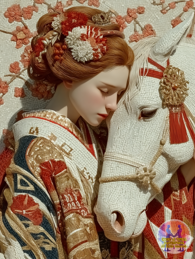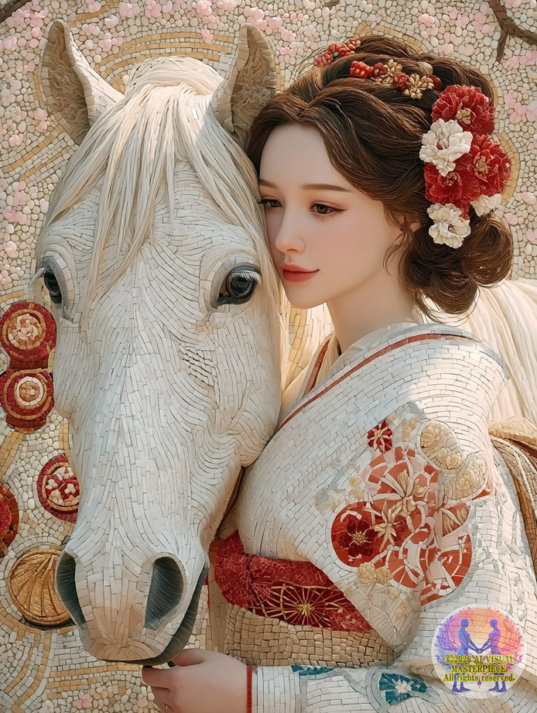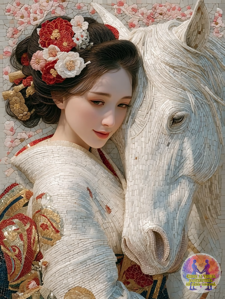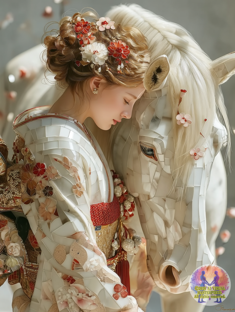 白く美しい「神馬」と、桜と新年の祝福に彩られた着物美人が、世界初「ネオ・モザイック・ステンドグラス」技法により、永遠の芸術として結晶化されました。